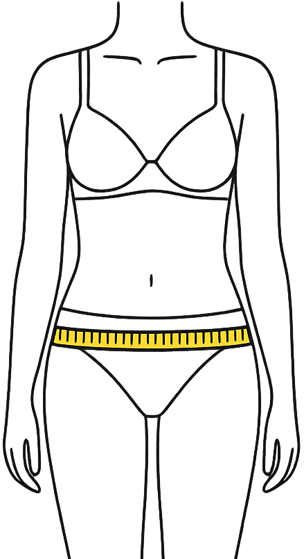 Para medir el contorno de cadera, juntá los pies y ubicá el centímetro en la parte más ancha de la cadera, que corresponde al punto de mayor volumen de la cola, rodeando toda la zona.